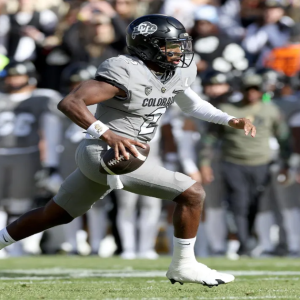 BOULDER, COLORADO – NOVEMBER 11: Quarterback Shedeur Sanders #2 of the Colorado Buffaloes carries … More the ball for a touchdown against the Arizona Wildcats in the first quarter at…