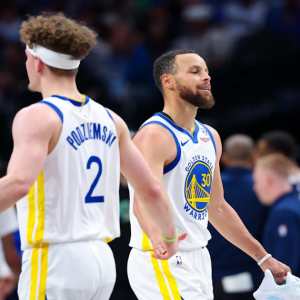 Apr 5, 2024; Dallas, Texas, USA; Golden State Warriors guard Stephen Curry (30) reacts with Golden State Warriors guard Brandin Podziemski (2) after losing his shoe during the first half…