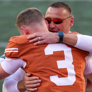 Texas Longhorns head coach Steve Sarkisian hugs Texas Longhorns quarterback Quinn Ewers during senior day / Ricardo B. Brazziell/American-Statesman / USA TODAY NETWORK via Imagn Images Texas Longhorns quarterback Quinn…