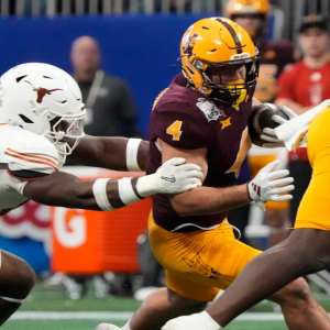 Arizona State running back Cam Skattebo (4) is tackled by Texas linebacker Barryn Sorrell (88) during the first quarter of the Chick-fil-A Peach Bowl in Atlanta on Wednesday, Jan. 1,…