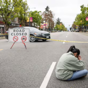 A woman prays on Vancouver’s Fraser Street on Sunday for the victims who were hit by a car driven through the Lapu Lapu festival the night before. (Ben Nelms/CBC) Kai-Ji…