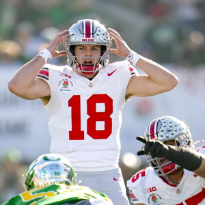 Ohio State Buckeyes quarterback Will Howard (18) motions at the line of scrimmage during the College Football Playoff quarterfinal against the Oregon Ducks at the Rose Bowl in Pasadena, Calif….