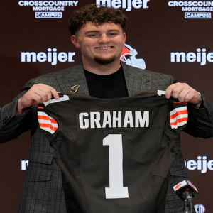 Cleveland Browns first-round draft pick, fifth overall, defensive tackle Mason Graham smiles as he poses for a photo with a jersey at an NFL football news conference in Berea, Ohio,…