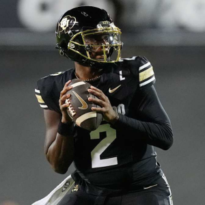 Nov 16, 2024; Boulder, Colorado, USA; Colorado Buffaloes quarterback Shedeur Sanders (2) looks on before the game against the Utah Utes at Folsom Field. Mandatory Credit: Ron Chenoy-Imagn Images /…
