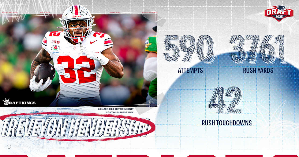 With pick 38, the Patriots draft Ohio State RB TreVeyon Henderson.Really good running back. Henderson ran for 1,016 yards with 10 touchdowns last season. He also caught 27 passes for 284 yards.