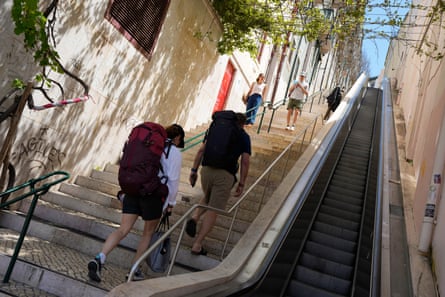 People walk up steps in Lisbon next to an inactive escalator, 28 April 2025. Photograph: Armando França/AP