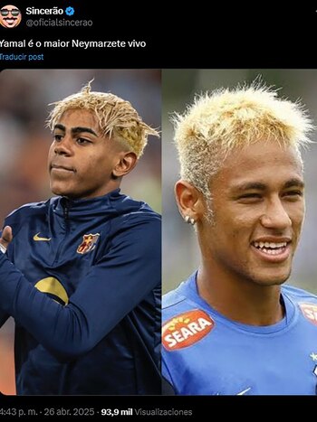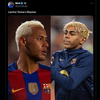 Durante el apasionante encuentro, los internautas reaccionaron ante cada acción destacada del juego y comenzaron a publicar los clásicos memes y comentarios con humor. Uno de las imágenes más compartidas fue el look de Lamine Yamal. El joven futbolista del Barcelona lució una cabellera teñida de rubio y no faltaron las comparaciones con Neymar, el brasileño que utilizó el mismo color en su pelo cuando jugaba en el equipo culé.