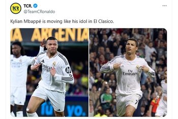 En la segunda mitad, Real Madrid reaccionó con el ingreso de Kylian Mbappé, quien anotó el empate transitorio con un golazo de tiro libre. Algunos usuarios de las redes sociales detectaron que el festejo del francés fue similar al de Cristiano Ronaldo, otra estrella del Merengue y también especialista en ejecutar la pelota parada. Rápidamente llegó el segundo con un cabezazo de Aurelien Touchameni y los ánimos se revirtieron.
