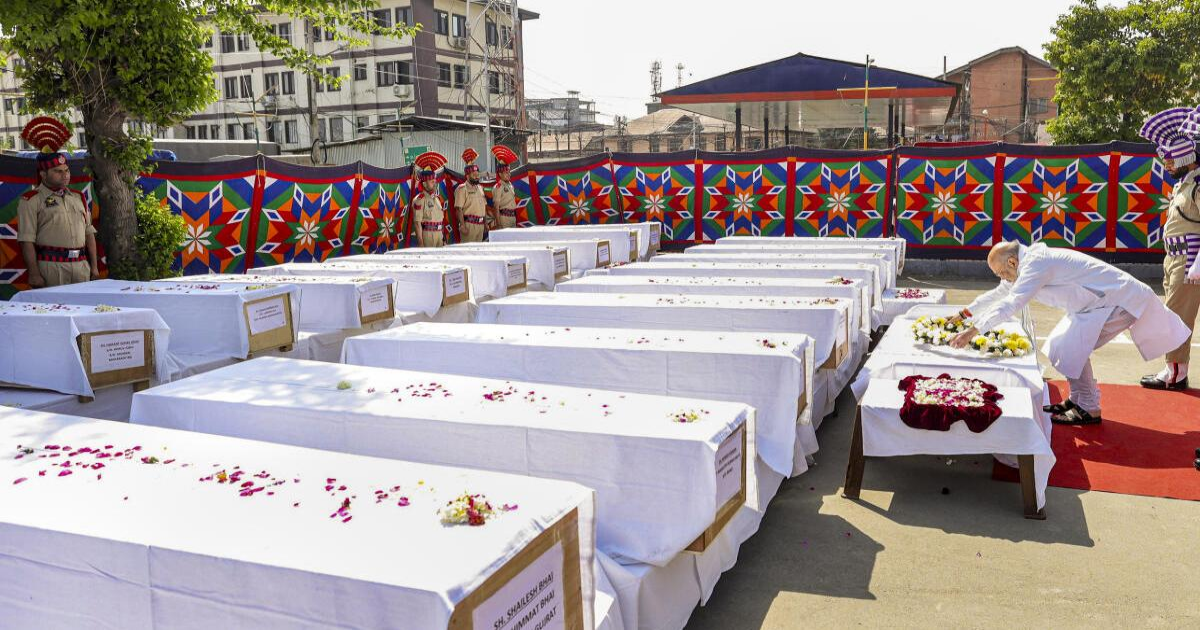 Union Home Minister Amit Shah pays his last respects to 26 people killed in the Pahalgam terror attack in Srinagar, Jammu and Kashmir. | Photo Credit: PTI