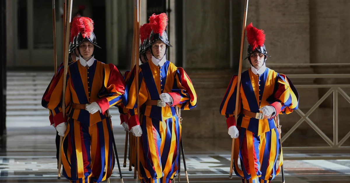 Vatican Swiss Guards march in the atrium of St. Peter’s Basilica at the Vatican this morning before the body of Pope Francis will lie in state for three days.