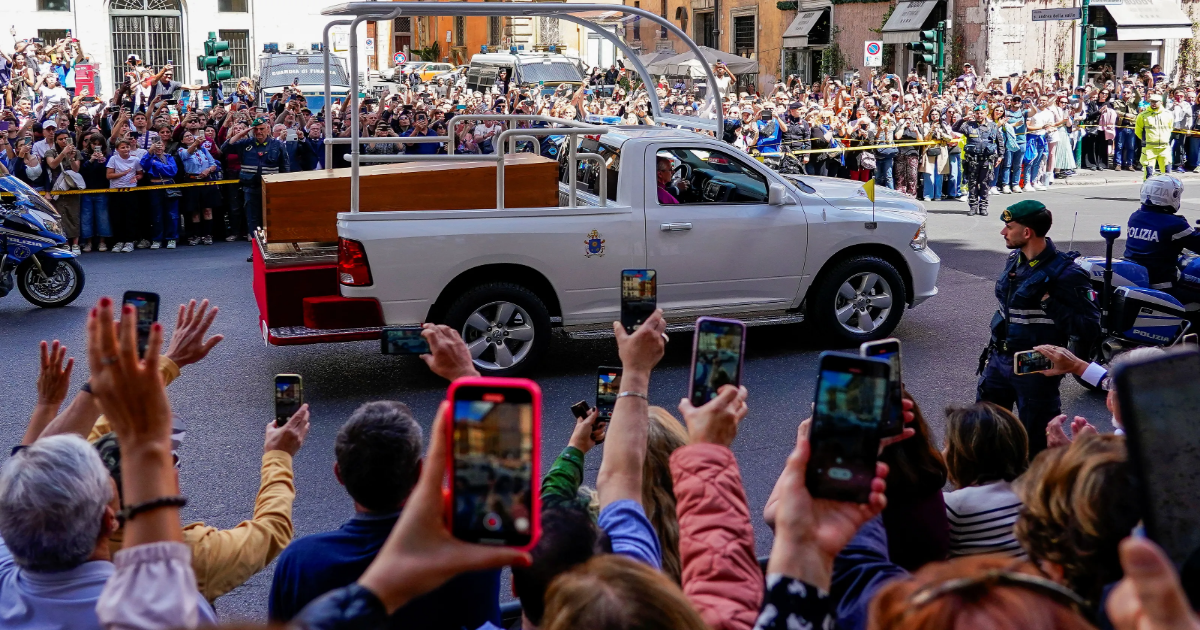 Pope Francis’ coffin was carried in an open-air popemobile, a white Mercedes-Benz bearing Vatican flags, through the streets of Rome in a motorcade.