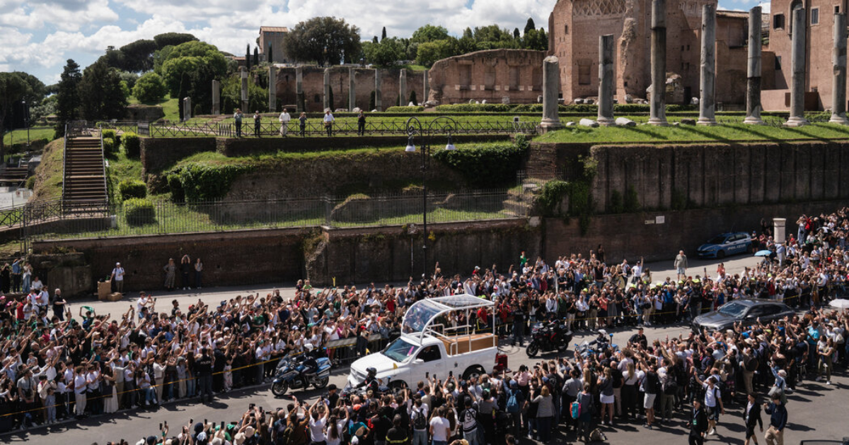 Hundreds of thousands of faithful filled and spilled out of St. Peter’s Square and streamed down the long avenue to the Tiber River. In the previous days, about 250,000 waited on long lines to say farewell to the pope, whose body was dressed in red vestments and scuffed black shoes, as he lay in state before the basilica’s altar.