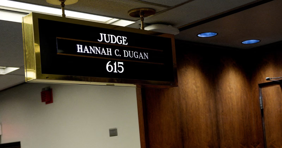 A view shows a sign with the name of Wisconsin county judge Hannah Dugan inside Milwaukee County Courthouse, after Dugan was arrested by U.S. officials, charging her with helping a man in her court evade immigration authorities in an escalating dispute between President Donald Trump’s administration and local officials over immigration enforcement, in Milwaukee, Wisconsin, U.S., April 25, 2025.