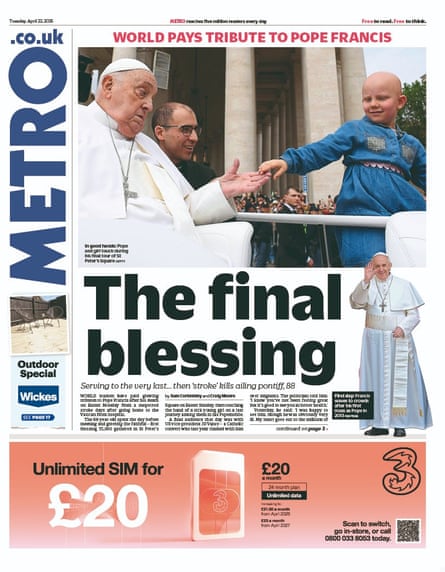 “The final blessing” was the paper’s main headline, featuring a photo of Pope Francis touching the hand of a small child in St Peter’s square.