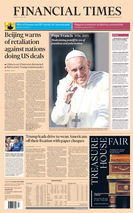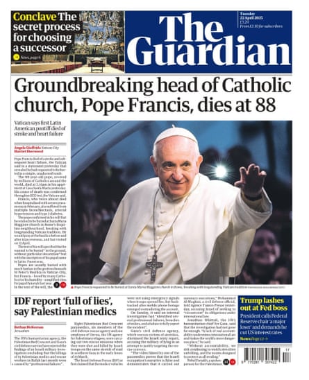 “Groundbreaking head of Catholic church, Pope Francis, dies at 88”, says the Guardian, featuring a picture of the late pontiff in a white soutane with his arm outstretched to the crowd.